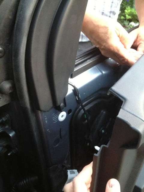Då var kåpan flyttad och spegeln bytt :-) Dörrpanelen var bara att rycka loss med början vid spegeln. Fick lov att lossa den en bit in för att komma åt elkontakten som sitter ungefär bakom insidans öppningshandtag. Bra att ha var ett spärrskaft modell mindre och kniv och skruvmejsel att bända med ...