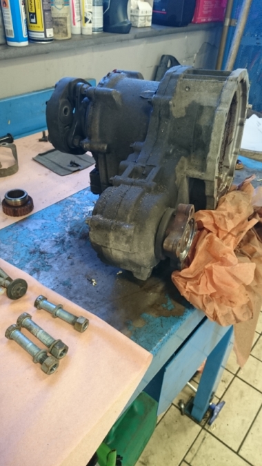 Lådan nere, så tung! Hela lådan skall rivas, drev, kuggar, axlar, konverter, olja rubbet!