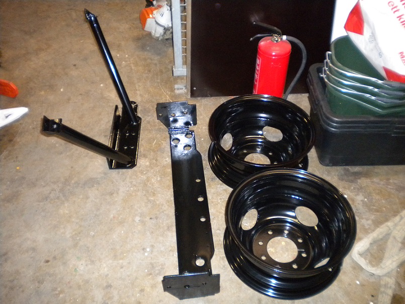 Jaha ! slut på vinterdvalan !!!!! Fick ett litet ryck och körde ner lite delar för pulverlack. Det blev så här. Och så fick jag köpt en ny vänster tank som ska målas den med. Risken är att jag får den att rulla i år :shock: Och fan vad bökigt med däck till den ! 7,50-16" stod det på dom som sitter på . TRAKTOR däck var det första som kom upp :lol: Dom är så lassgamla !!!!