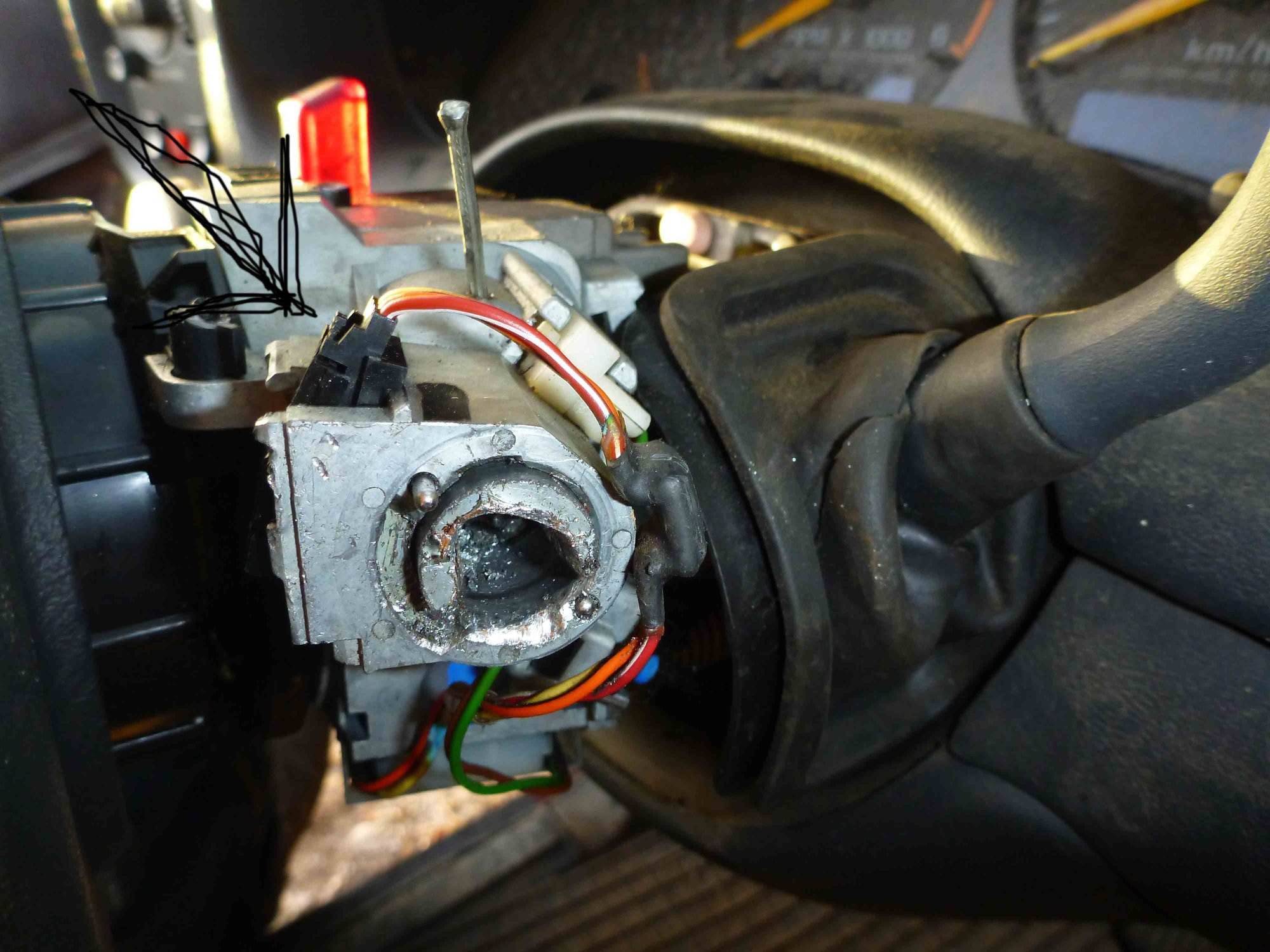 jag har borrat ur tändningslåset för nyenkel var borta så startar med skruvmejsel på den lilla biten som vart kvar efter att jag borrade bort pinnarna