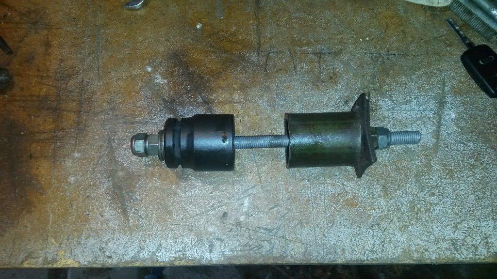 Bifogar bild när nya bussningen monteras i bärarmen samt "verktyget" jag gjorde för att få den på plats. Första gången hade jag endast en mutter på gängstången och då rensade jag den på gängorna, så jag fick ta en ny gängstång och köra med dubbla muttrar för att fördela kraften över större yta. Svårt att säga hur mycket man behövde dra med. Men om jag försöker översätta till hur 120NM på ett par hjulbultar känns till NM jag drog med nu så var det väldigt mycket mer, kanske en bit över 300, men det är ju svårt att uppskatta såklart.