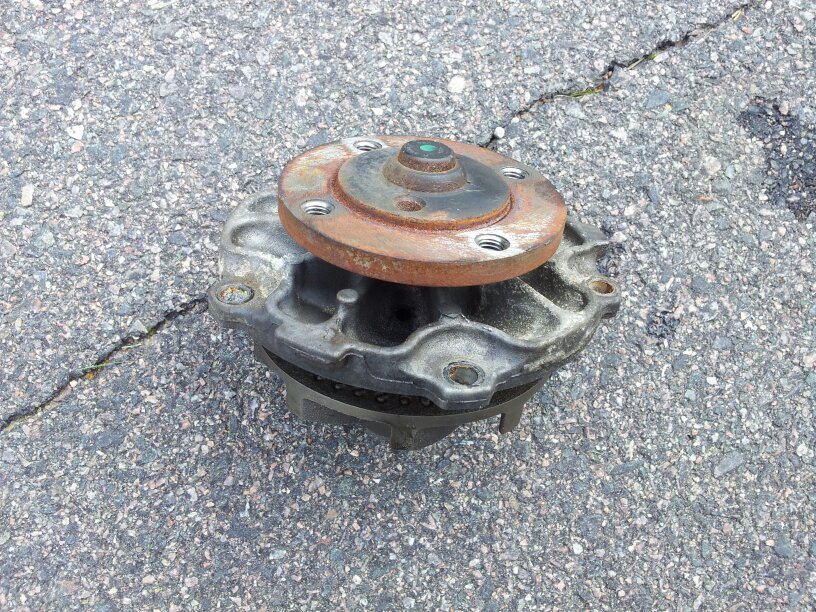 Idag har jag skaffat ny pump och bytt den, det var ganska enkelt. Svåraste momentet var att få loss bultarna till remskivan, men jag kilade fast en 19 mm blocknyckel mellan två bultar och axeln så gick det att hålla emot. Resten var inga problem alls. Det tog ungefär 20 min allt som allt.