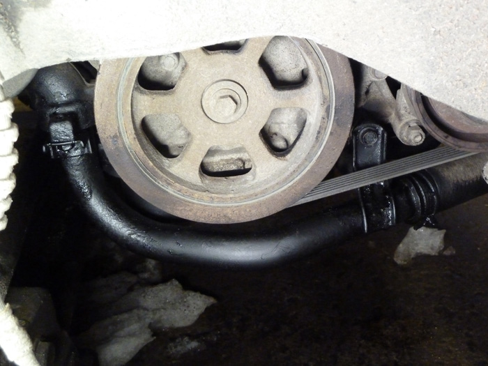 Med borttaget högerhjul blir det "lätt som plätt". Du behöver inte plocka bort någonting utöver hjulet.Var noga med rörets anläggning i vattenpumpen där det nog finns rost avsatt från röret. På bild 2 är det nya röret rejält rostskyddat.