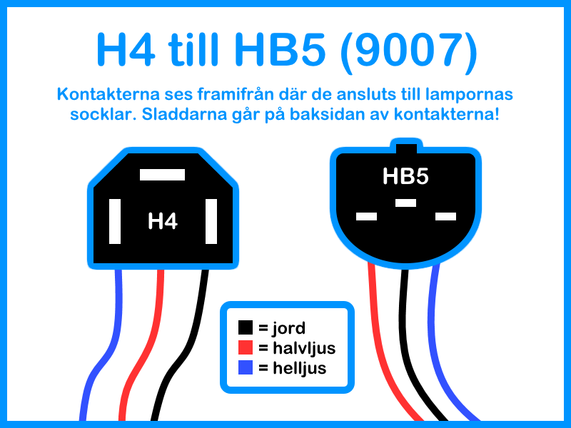 Gjorde en enkel skiss som beskriver "kopplingsschemat" mellan H4-kontakter och HB5-kontakter, om du skulle välja att köpa USA-strålkastare: