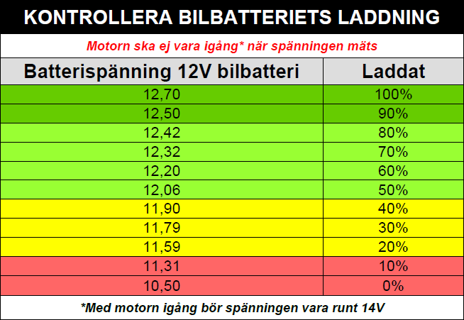 Gjorde en tabell (nedanför) som beskriver ett bilbatteris kondition, finns även liknande uppställningar om man söker på google.